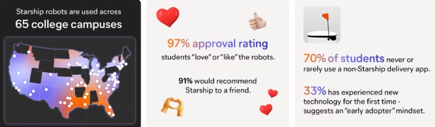 People love delivery bots! New data from Starship Robotics shows that 97% of students love or like the company’s machines. Starship served 65 university campuses in 2025, traveling 1.5 million miles.