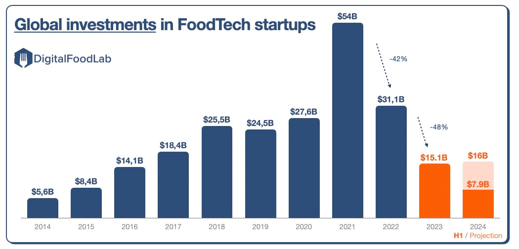 The foodtech sector has had a rough few years, with investments falling from a 2021 high of $54 billion. New data from DigitalFoodLab suggests a recovery is finally here, with 2024 on track to hit $16 billion, up 6% from last year.